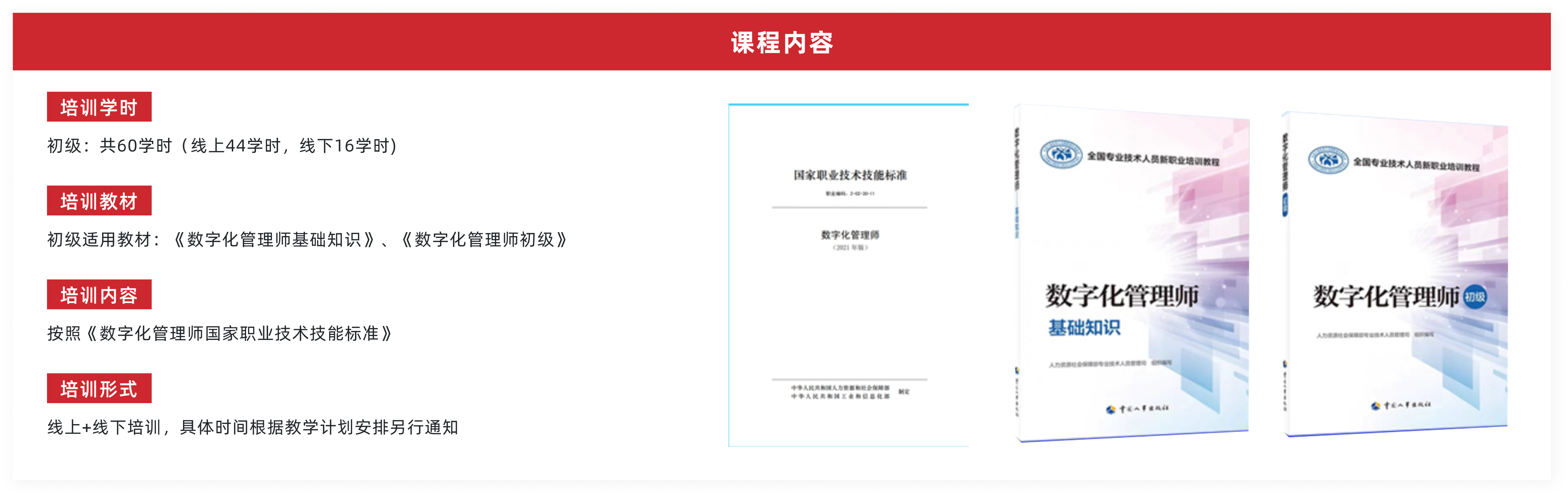 通过系统培训,使学员掌握数字化的基础知识,熟悉数字化管理的技能与原理,了解数字化组织的核心特征、数字化沟通方式、数字化协同类型等,掌握数字化管理平台的开发管理,并了解数字化管理在数字化经济中的应用场景,达到人社部印发的《数字化管理师国家职业技术技能标准(2021年版)》的职业等级标准。协助相关企业和组织充分发挥数字化管理在提升管理效率、降低管理成本、精准数据决策、真正以客户为中心的技术支撑作用。