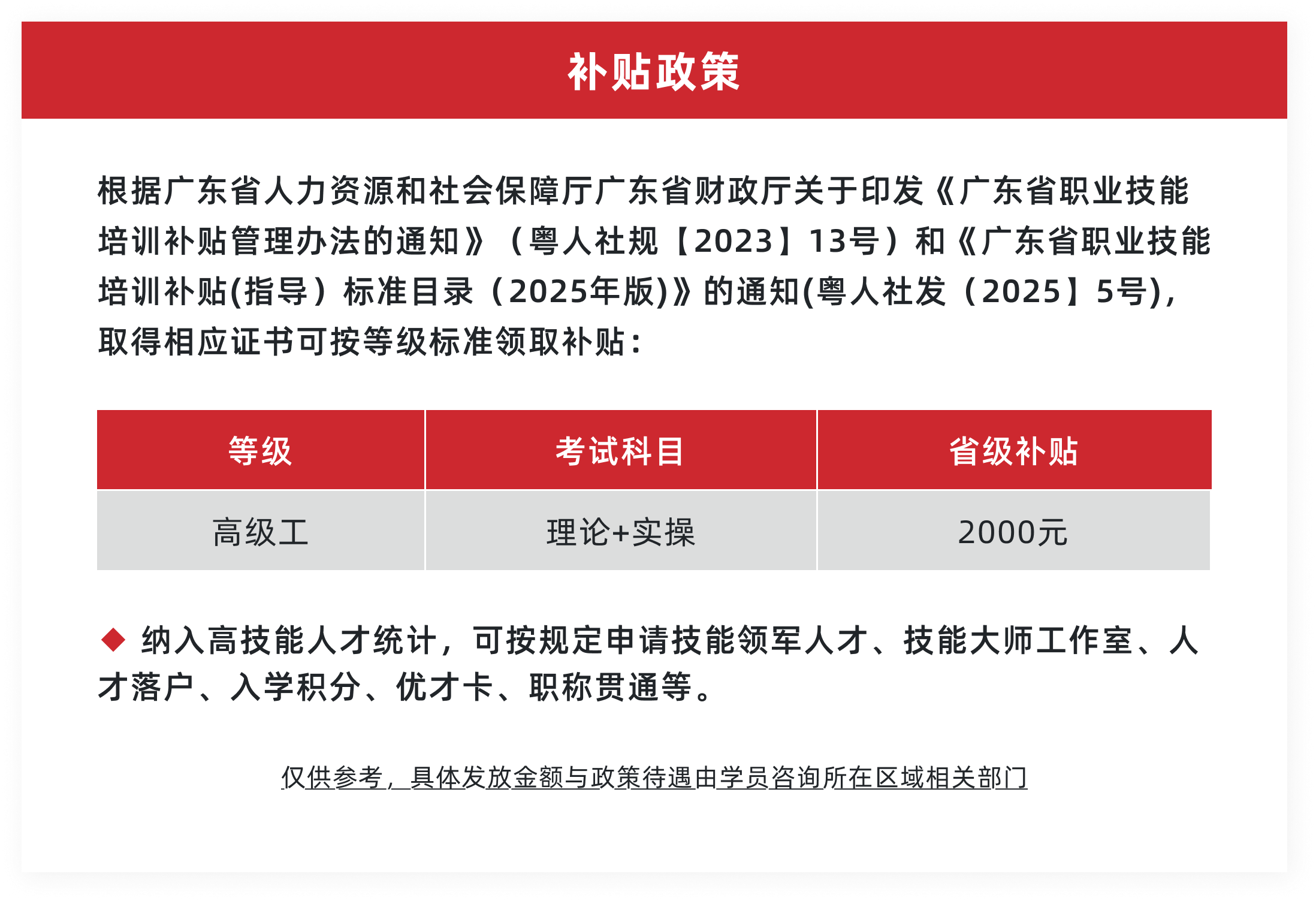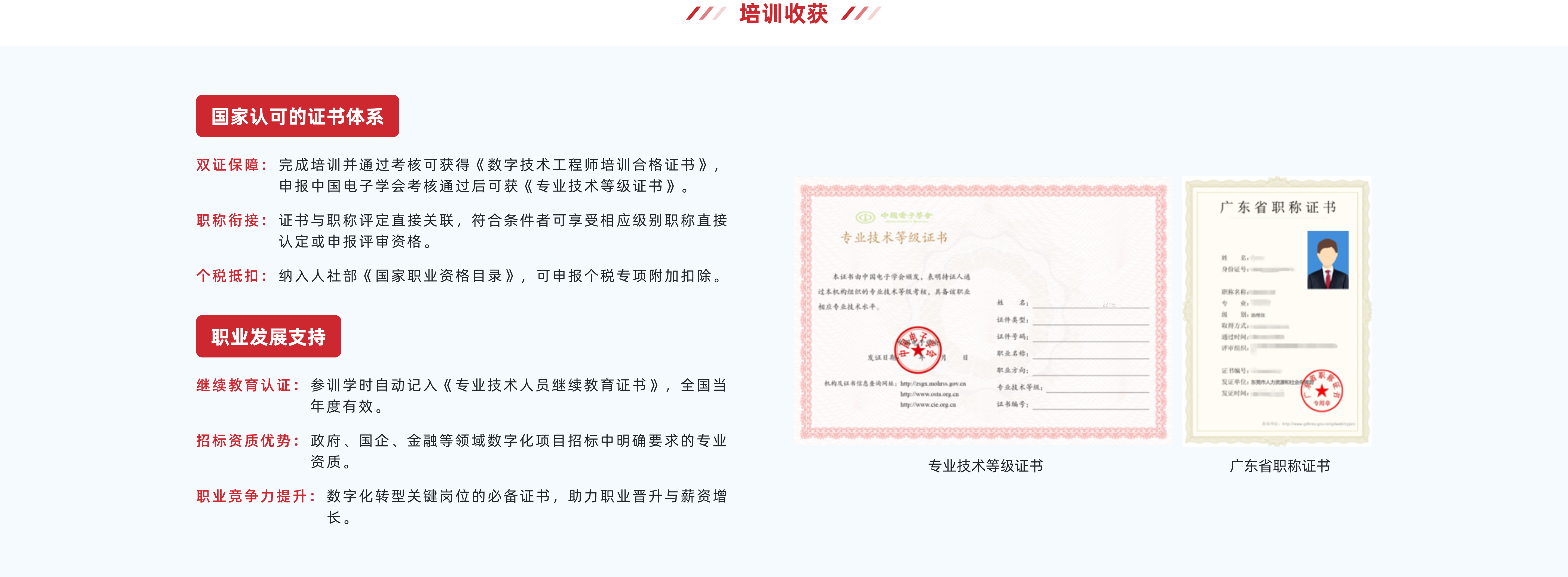 ②职称认定:取得数字技术工程师培训项目初级、中级专业技术等级证书的,可纳入各地各部门相关专业初级、中级职称认定范围;取得高级专业技术等级证书的,可作为申报高级职称评审的重要参考;认定程序和材料要求《广东省初次职称考核认定规定》执行。