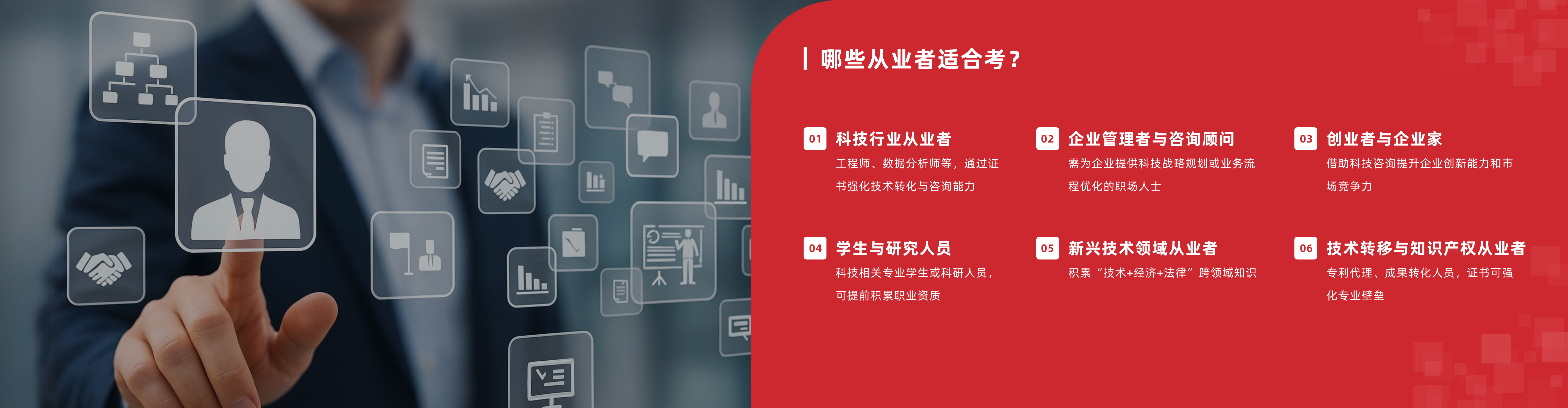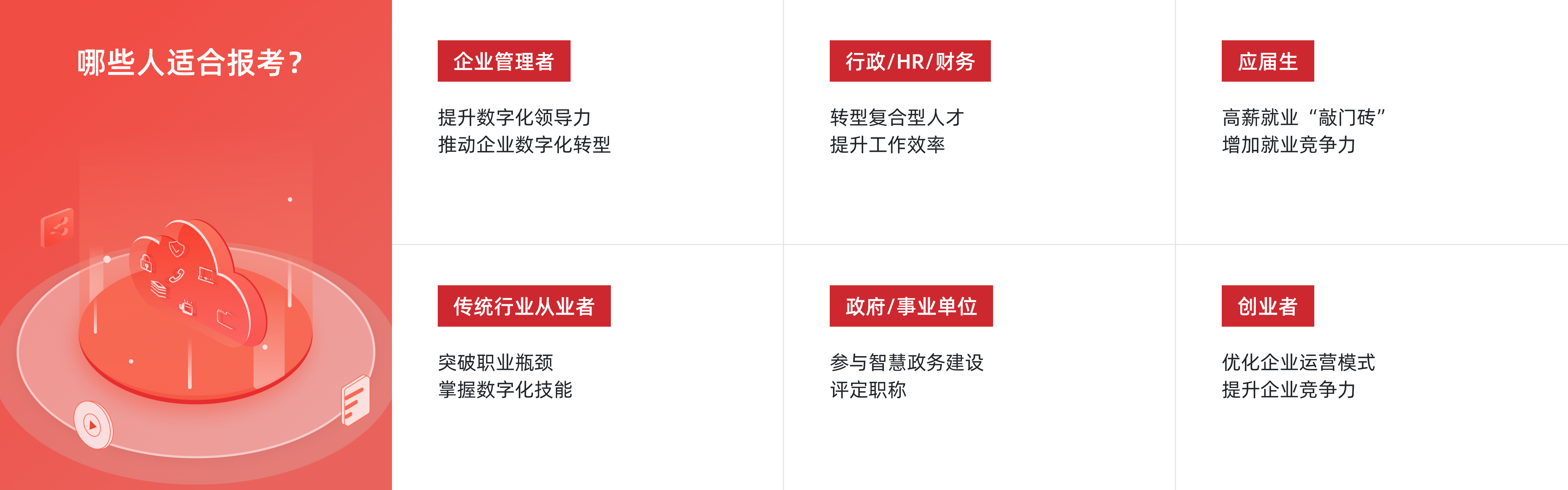 通过系统培训,使学员掌握数字化的基础知识,熟悉数字化管理的技能与原理,了解数字化组织的核心特征、数字化沟通方式、数字化协同类型等,掌握数字化管理平台的开发管理,并了解数字化管理在数字化经济中的应用场景,达到人社部印发的《数字化管理师国家职业技术技能标准(2021年版)》的职业等级标准。协助相关企业和组织充分发挥数字化管理在提升管理效率、降低管理成本、精准数据决策、真正以客户为中心的技术支撑作用。